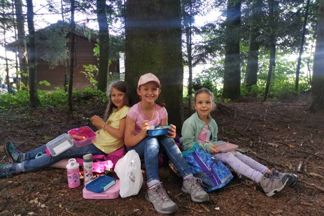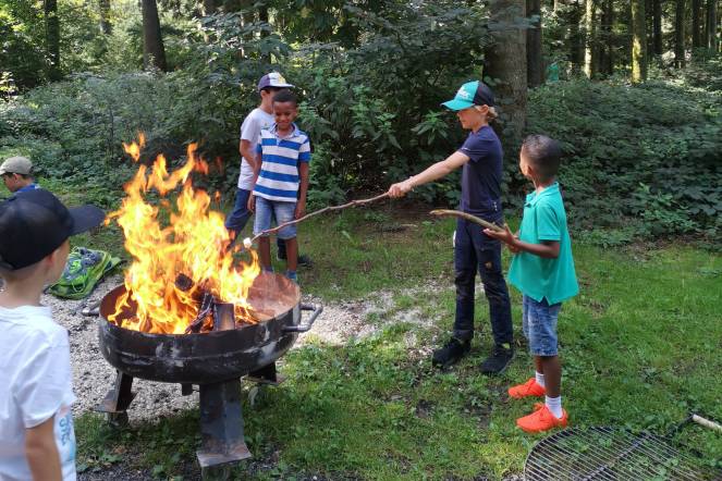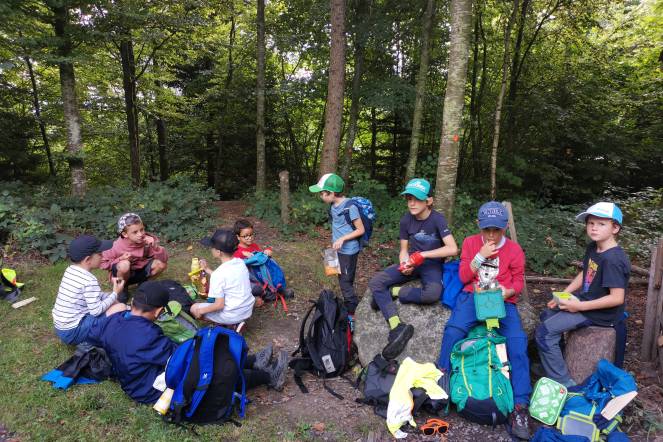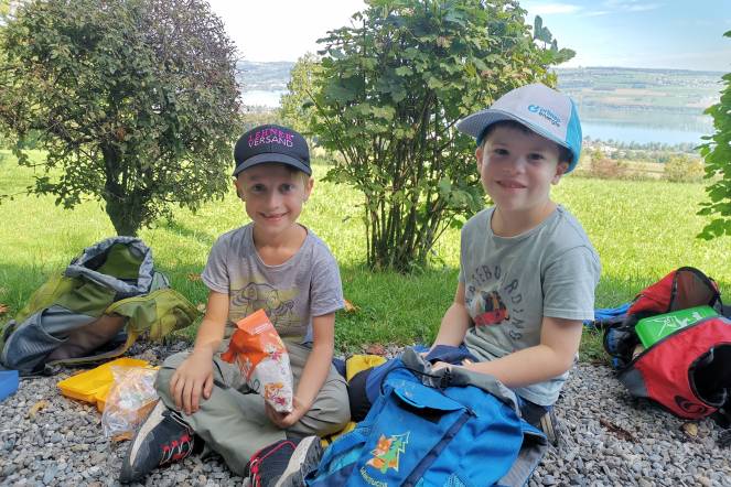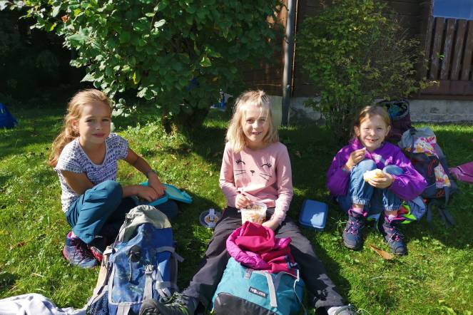 Wir starteten unsere Wanderung beim Schulhaus und liefen los Richtung Nottelerwald zur Schweizer Familie Feuerstelle. Dort angekommen stärkten sich die Schülerinnen und Schüler nach dem steilen Anstieg während einer Znüni- und Spielpause. Nach einem Weilchen liefen wir weiter, verliessen auf der Höhe den Nottelerwald und kamen bald schon zum Eierwald. In der Jägerhütte wurden wir bereits von Alois Furrer begrüsst, welcher für uns sogar schon Feuer gemacht hat. So konnten die hungrigen Mägen schon bald mit einem feinen Cervelat, einer Wurst oder einem leckeren Sandwich gestillt werden. Nach dem Mittagessen blieb den Kindern noch genug Zeit, um ausgiebig im Wald zu spielen und Hütten zu bauen. Am Nachmittag machten wir uns wieder auf den Heimweg. Zum Glück ging es bis zum Schulhaus nur noch bergab. 😉