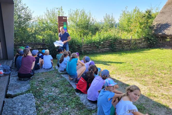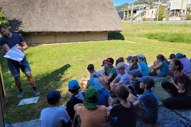 Nach einer kurzweiligen Anreise nach Wauwil teilten wir die drei Klassen in zwei Gruppen auf. Die erste Gruppe machte eine Führung in der Pfahlbausiedlung, spielerisch gingen sie zurück in die Steinzeit. Mit vielen Bildern erklärte Herr Camenzind wie sich das Leben auf diesem Platz vor Tausenden von Jahren abspielte. Die Kinder sahen auch, wie die Steinzeitmenschen in kleinen Fellzelten lebten. Viele spannende Einblicke wurden mit dem in der Schule gelernten Themen kombiniert.