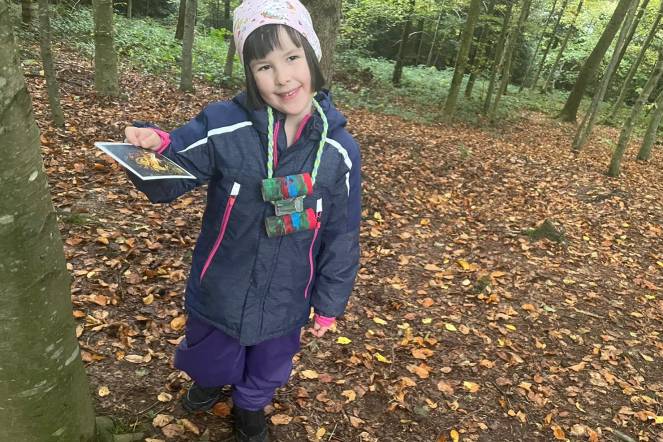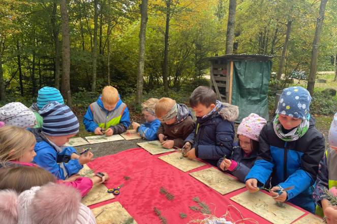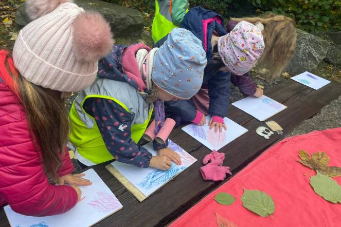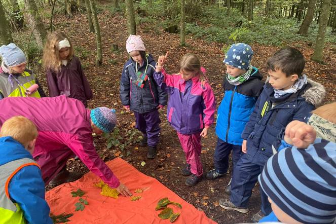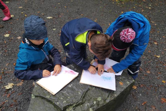 Als erstes konnten die Kinder erzählen, welche Waldbewohner ihnen bereits bekannt sind und lernten durch ein Suchspiel weitere Tiere kennen. Danach wurden fleissig Herbstblätter gesammelt und bestimmt. Dabei haben wir festgestellt, dass jeder Baum andere Blätter und eine andere Rinde hat. Durch ein Tastspiel fühlten wir blind die unterschiedlichen Bäume. Nach einer kurzen Znünipause nutzten wir die Blätter, um Frottageabdrücke zu zaubern. Wie es die Eichhörnchen machen, sammelten wir in einem Spiel ebenfalls Nussvorräte und versteckten sogar eine Nuss. Mal schauen, wer am Ende des Morgens seine Nuss noch findet und welche eventuell von einem anderen Eichhörnchen stibitzt wurde.