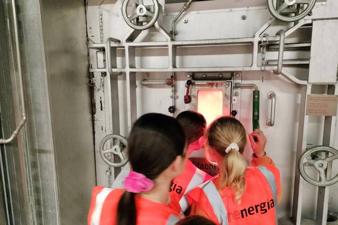 Danach haben wir die Klassen aufgeteilt und wurden durch die Renergia geführt. Wir gingen in eine grosse Halle. Dort haben Lastwagen Abfall in einen grossen Bunker abgeladen. Der Abfall wurde mit einem riesigen Greifer entweder zerkleinert oder sofort verbrannt. Das Feuer war sehr gross und 1000 Grad Celsius heiss. Wir durften die zehn Meter hohen Flammen durch ein kleines Fenster betrachten. Ab und zu war ein Horn zu hören. Wenn wir das Horn hörten, mussten wir unsere Ohren zuhalten, da in einem Feuerbunker gerade gesprengt wurde, um den Ofen zu reinigen. Kommen wir wieder zum Feuer. Die Wände der zwei Verbrennungsöfen enthalten Wasserrohre. Das Wasser verdampft in den Rohren. Dabei entsteht ein grosser Druck. Dieser Dampf bringt eine Turbine zum Drehen. Dabei wird in einem Generator Strom erzeugt. Mit der Energie die, die Renergia produziert, kann man ganz Luzern mit Strom versorgen.