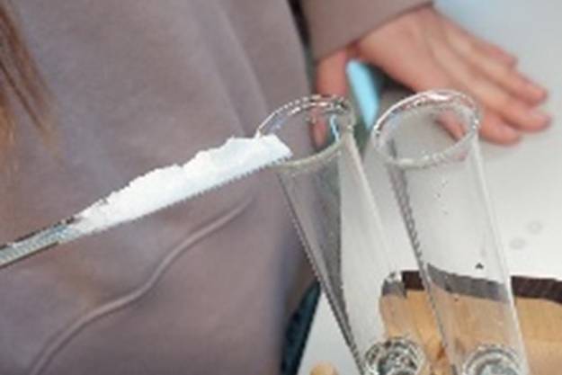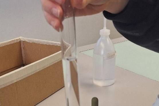 Speichel in eines der beiden Reagenzgläser geben und nicht mehr schütteln. Dann wartet man 5 Minuten und schaut, was sich verändert hat.