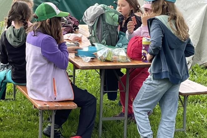 Wir hatten einen grossen Baumstamm das Tobel hoch gezogen. Ich hatte folgendes dabei: Jumpy's, Ovo Rocks, Marshmallows, ein Stück Brot und eine Wurst. (von Flavio)