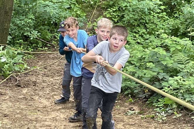 Wir haben eine Hütte gebaut. Wir haben mit den Jungs einen Baumstamm hochgetragen. (von Mayla)
