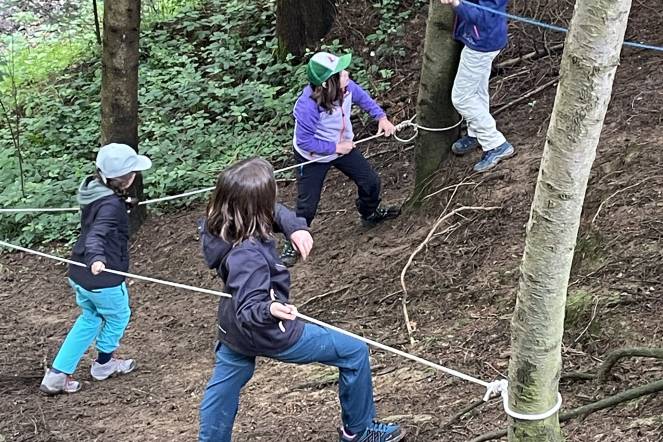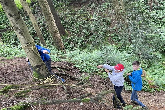 Leona, Enya, Laura und ich haben in einem Hang Seile an die Bäume geknüpft. Dann haben uns die Jungs nachspioniert. Dann haben wir uns ein Geheimversteck gebaut. (von Elena)