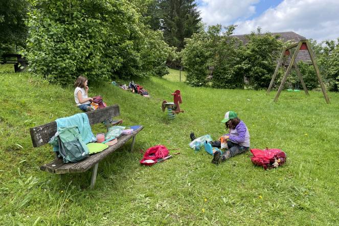 Gestern Morgen hat mein Vater mich und Rinesa zum Bahnhof Nottwil gefahren. Als alle da waren, gingen wir zum Zug. Wir sind gelaufen und waren beim Znüni essen im Wilden Westen. Wir sind weiter gegangen, haben ein paar Fröschen gesehen und hatten alle Spass. Dann haben Frau Gysin und Frau Perl uns den Wald gezeigt und wir konnten los. Fast alle haben ein Schneckenhaus gehabt. Ausser ich und Rinesa. Alle Schneckenhäuser waren weg und es hatten alle das Gefühl, wir hätten die Schneckenhäuser gestohlen, aber wir waren es nicht und rannten weg. Es war Lenn, der die Schneckenhäuser gestohlen hat und alle haben uns in Ruhe gelassen. Nach etwa 2,5 Stunden gingen wir zum Bahnhof Reiden. Am Kiosk konnten wir eine Glace essen. Entweder eine Rakete oder eine Twister. Ich und Rinesa haben eine Twister genommen. Zum Glück erreichten wir den Zug und alle sind heil und dreckig in Nottwil angekommen. Enya, Rinesa und ich wurden von meinem Vater nach hause gefahren. (von Julia)