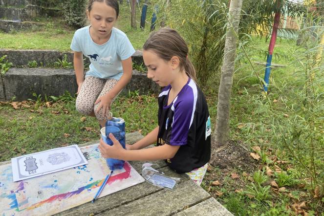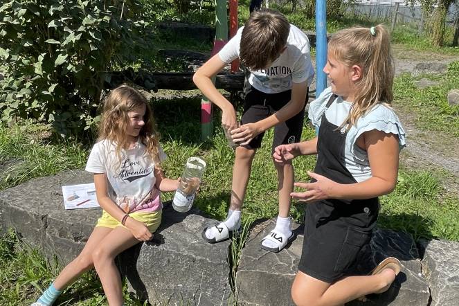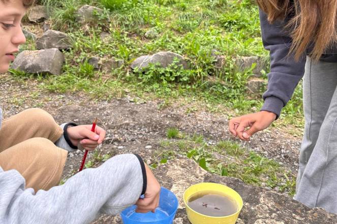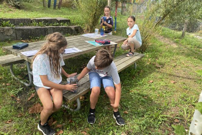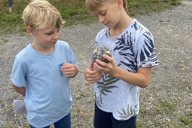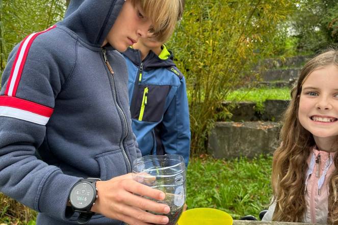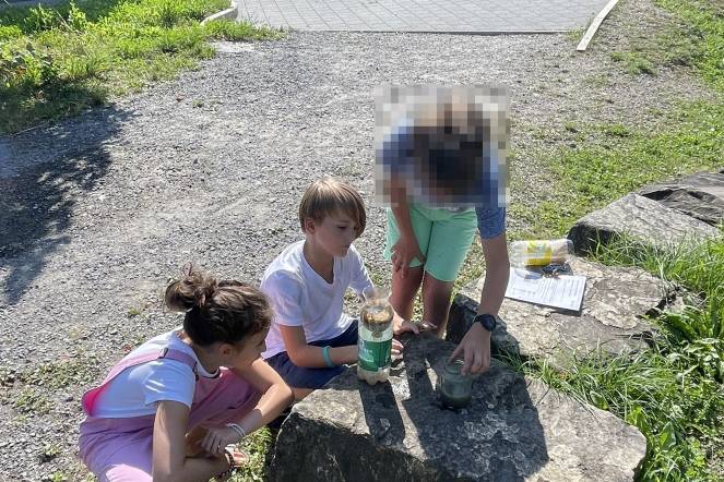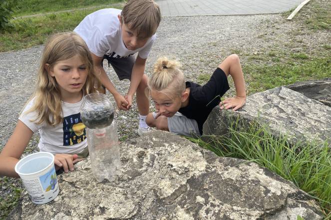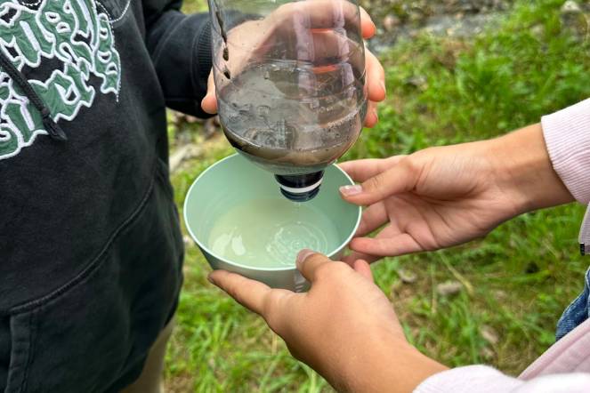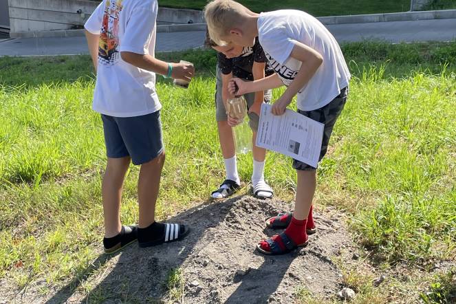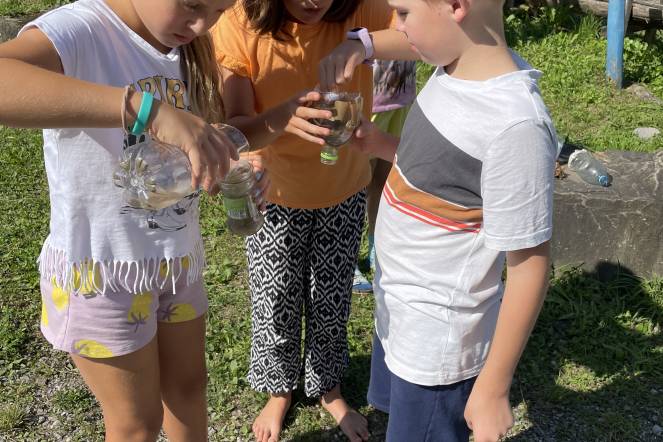 Um zu demonstrieren, was unter der Erde mit dem Wasser passiert, haben wir einen Wasserfilter gebaut und natürlich auch ausprobiert. Dafür haben die Kinder in Gruppen eine PET-Flasche halbiert und in den oberen Teil Watte, Sand, grober Sand, feiner Kies und grober Kies geschichtet. Das Herstellen von Dreckwasser hat besonders Spass gemacht. Alle waren gespannt, wie das schmutzige Wasser nach dem Filtern aussieht. Tatsächlich, die selbstgebaute Wasserreinigungsanlage funktionierte! Motiviert haben die Lernenden das Wasser gleich mehrmals durch den Filter gegeben. Die gesammelten Beobachtungen haben wir im Forscherheft festgehalten.