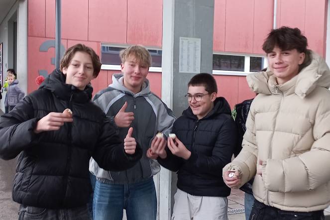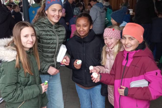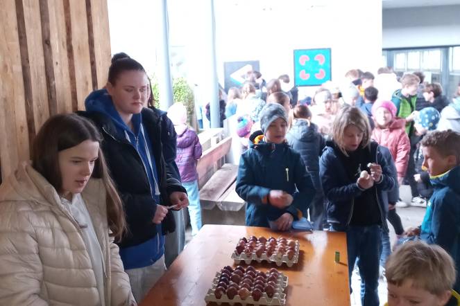 Alle Schülerinnen und Schüler vom Kindergarten bis zu der dritten Oberstufe waren dazu eingeladen. Das Wetter zeigte sich leider in diesem Jahr nicht von seiner frühlingshaften Seite. Dafür konnten wir mit 288 «getötschten» und gegessenen Eiern einen neuen Rekord aufstellen. Wir danken auch noch besonders den Schülerinnen und Schülern der 5. Klassen, welche die fast 300 Eier vorgängig gefärbt hatten.