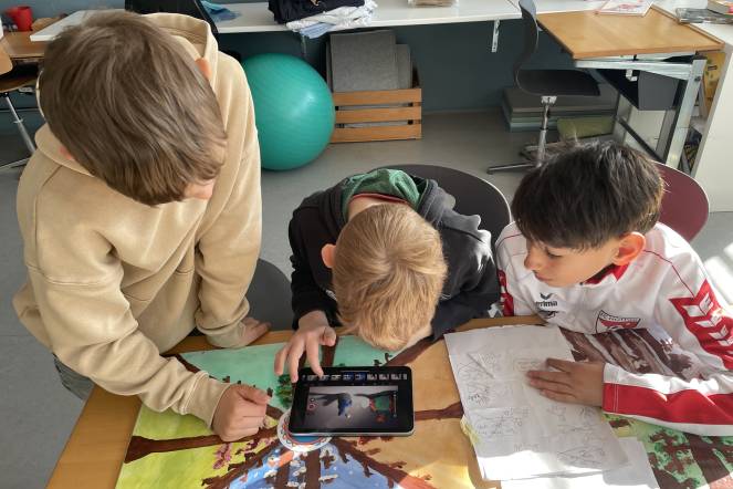 Bildbearbeitung / Collage: Die Kinder lernten verschiedene Techniken der Collage, sowohl analog als auch digital kennen. Sie erkundeten, wie man unterschiedliche Materialien und Bilder zu einem neuen Kunstwerk zusammenfügt. Anschliessend erstellten sie gemeinsam mit dem Künstler Urs Heinrich aus Sempach eine grosse Collage, die die Vielfalt ihrer erlernten Fähigkeiten zeigte.