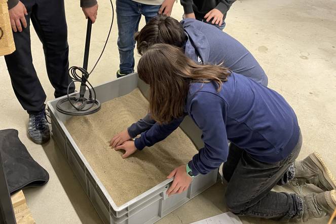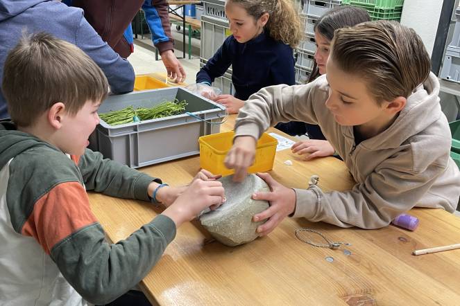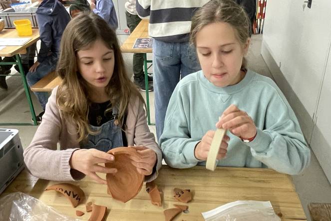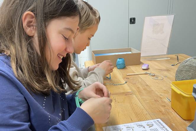 Die verschiedenen Workshops boten den Kindern die Möglichkeit, selbst aktiv zu werden. Mit dem Metalldetektor konnten sie verschiedene Metallgegenstände aufspüren. Weiter konnten sie Zwirnen, ein Skelett zusammenbauen, ein Spiel herstellen und Scherben zu einem Tongefäss zusammensetzen.