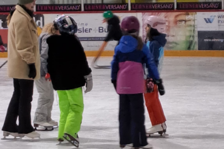 Als wir endlich bei der Eishalle ankamen, schnappten sich alle Kinder Helm und Handschuhe, liessen die Schlittschuhe von den Lehrpersonen fachgerecht montieren und waren nun bereit aufs Eis zu gehen.
