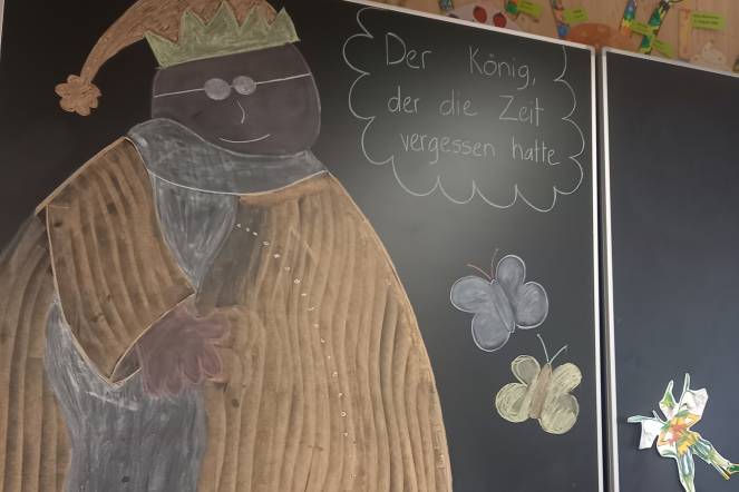 Der König ist schwer krank. Er hat alles über die Zeit vergessen. Zum Glück helfen ihm die 1. und 2. Klässler:innen beim Lernen der Zeit. So erfährt er Stück für Stück wieder die Jahreszeiten, die Wochentage, Monate und auch die Uhrzeit. Sein Kalender füllt sich langsam wieder und wir hoffen, dass der König bald wieder gesund ist.