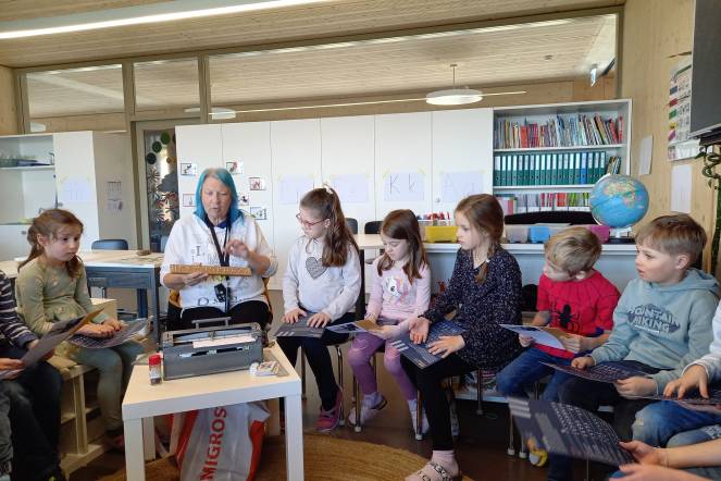 Die 1. Klässler:innen beschäftigen sich im Moment mit den Sinnen. Passend zum NMG-Thema hatten wir heute Besuch von Juli. Juli ist blind und konnte uns viele spannende Einblicke in ihren Alltag geben. Wie kannst du lesen? Hast du einen Blindenhund? Wie spielst du Spiele? Welche Tricks hast du zum kochen? Juli hat viele Fragen beantwortet und interessante Hilfsmittel gezeigt. "Wie cool!", meinten die Kinder zu ihrem Mile-Stone, mit dem sie wichtige Notizen aufnehmen und später abhören kann. Auch die speziellen Würfel, die Jass-Karten, die Schreibmaschine und natürlich der Blindenstock waren sehr beeindruckend. Wir freuen uns darauf, Juli vielleicht einmal in Nottwil anzutreffen. Herzlichen Dank für den Besuch!