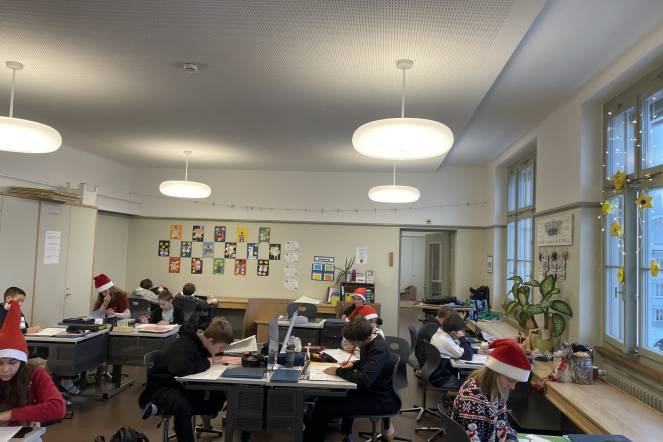 Die Klasse 6b geniesst die Adventszeit ganz besonders. Ab dem 1. Dezember (einige schon früher) werden Weihnachtslieder gehört (aber nur das Original! Kein Fake!) und Weihnachtspullover und Nikolaushüte gehören zur täglichen Garderobe. Auch sonst wird diese ganz besondere Zeit so richtig zelebriert.