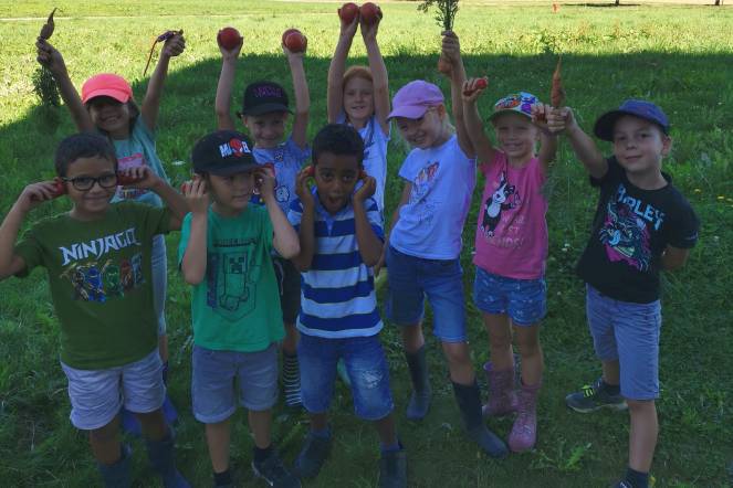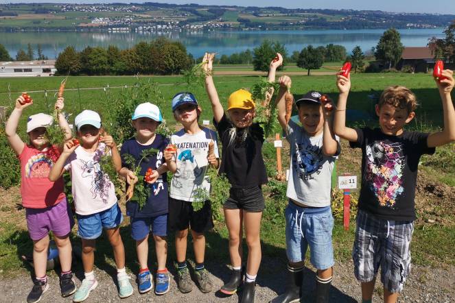 Im Garten der jüngsten Primarschulkinder gibt es jede Menge Gemüse zum Ernten. Dank der Arbeit der Kinder und Lehrpersonen, welche seit dem Frühling immer wieder den Garten gepflegt und gehegt haben, ist alles so schön gewachsen. Die neuen Erstklasskinder durften bis anhin von der Arbeit ihrer Vorgängerklassen profitieren und bereits viele Leckereien aus dem Schulgarten kosten. Nun war es an der Zeit, selbst mal etwas Hand anzulegen. Ganz nach dem Motto «Zuerst die Arbeit, dann das kulinarische Vergnügen» jäteten und beseitigten die Kinder fleissig Unkraut oder gossen die Pflanzen. Zur Belohnung gab es dann ein Gemüse nach Wahl zum Geniessen. 😊