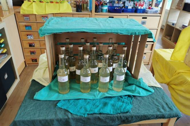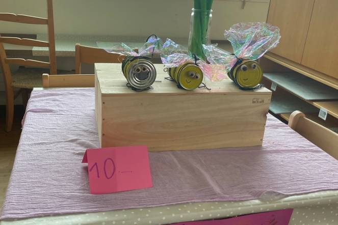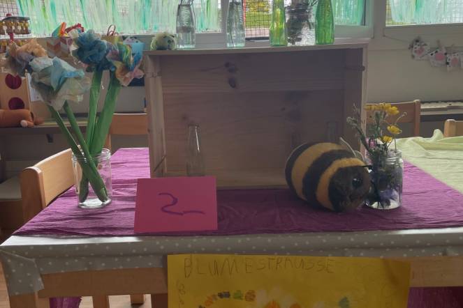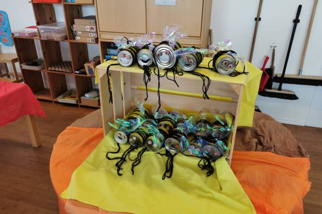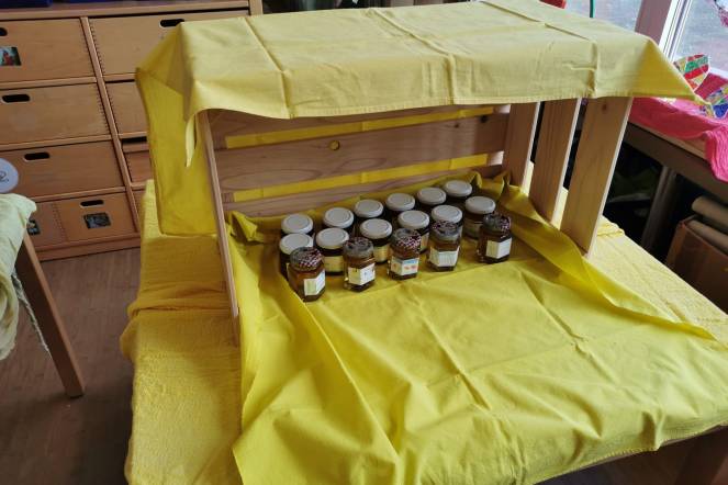 Begleitet von der Geschichte Hummel Bummel haben die Kinder aller Kindergartenklassen in den letzten Wochen mit viel Begeisterung und Kreativität verschiedene Dinge hergestellt. Diese wurden dann in dieser Woche in der Nachmittagsgruppe im Hofladen an die Eltern verkauft. Als Währung wurden bunte Muggelsteine und Goldmünzen eingesetzt. Fleissig wurde der Hofladen eingerichtet, dekoriert und beschriftet. Über die Preise wurde verhandelt und die beste Verkaufsstrategie.