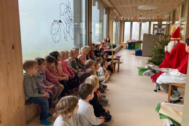 Der Samichlaus hat sich Zeit genommen, um eine spannende Geschichte zu erzählen. Die Kinder hörten aufmerksam zu, manche mit offenem Mund, andere kuschelten sich gemütlich in ihre Plätze. Nach der ersten grossen Aufregung, war nun eine schöne besinnliche Atmosphäre.