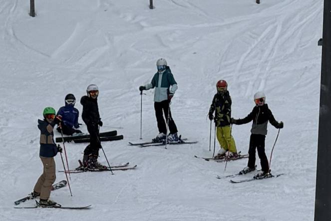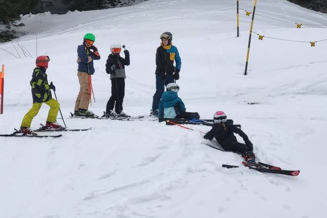 Nach einer ziemlich ruhigen Nacht…. wurden wir bereits um 7 Uhr geweckt und das Lagerleben ging weiter. Der Buschauffeur hatte kein Erbarmen und öffnete die Tür zu spät… so mussten einige Gruppen ihre Skis auf den Buckel nehmen und einen langen Fussmarsch bis zur Bahnstation machen. Im Skigebiet verteilten sich die Gruppen und waren mit ihren Leitern unterwegs. So fuhren alle ihrem Level entsprechend auf verschiedenen Pisten. Dazwischen gab es ein grosses Hallo, wenn man irgendwo eine andere Gruppe antraf.