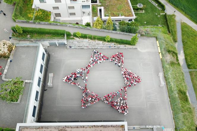 Ein besonderes Highlight war das grosse Gemeinschaftsfoto um 11:30 Uhr auf dem Fussballplatz. Alle Klassen versammelten sich sternförmig, um diesen farbenfrohen Moment festzuhalten. Die Stimmung war fröhlich und das Miteinander spürbar.