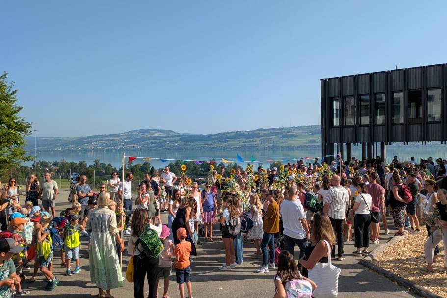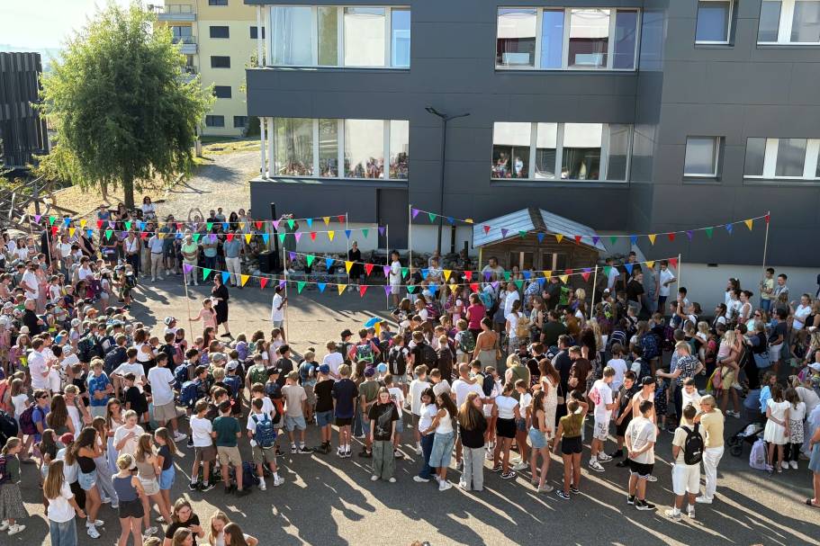 Ein farbenfrohes Bild bot sich auf dem Pausenplatz: Die Lernenden der 6. Klassen empfingen die fünf neuen Kindergartenklassen mit bunten Wimpeln, auf denen die Namen der Kinder standen. Mit viel Herzlichkeit und Applaus wurden die Kleinsten in die Gemeinschaft aufgenommen. Nach kurzen, inspirierenden Worten des Präsidenten der Bildungskommission, Stefan Federspiel, und der Schulleitung des Zyklus 1, Jasmin Willisegger, zogen die Kindergartenkinder durch ein leuchtendes Sonnenblumenmeer in ihre Schulhäuser ein – ein symbolischer Start in ihre Bildungsreise. Auch die drei neuen 1. Primarklassen wurden feierlich durch ein Spalier aus Blumen begleitet und als Klassen willkommen geheissen.